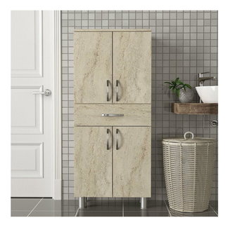 Materialul. De obicei veți întâlni mobilier de baie din lemn, mobilier laminat sau din fibre de lemn. Unele dulapuri sunt fabricate din plastic, metal sau chiar sticlă. Lemnurile mai puțin rezistente trebuie tratate cu un strat impermeabil de lac, lazură sau ceară. Acest strat este necesar să fie și din interiorul mobilierului. la alegere acordați atenție locului unde va fi plasat dulapul. Dacă mobilierul va fi stropit de apă în mod repetat, alegeți un tratament de suprafață care va fi foarte rezistent la apă. De asemenea concentrați-vă pe durabilitatea și suprafața anticorozivă a feroneriei balamalelor și a șinelor.
