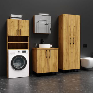 - Dulap sub chiuvetă - parte componentă a dulapului este și chiuveta, ceea ce poate ușura alegerea. Pentru tipurile fără chiuvetă, aceasta poate fi achiziționată separat, însă este necesar să fie un tip montat pe perete care să ascundă suficient spațiul pentru dulapul de dedesubt.