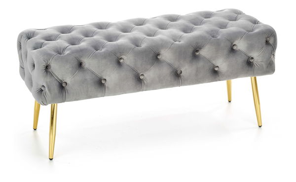 Banca Alesha în nuanțe de gri și auriu aduce rafinament și funcționalitate oricărui spațiu interior. Tapiteria din catifea moale, combinată cu detaliile capitonate, oferă un design modern și confortabil. Picioarele metalice aurii subliniază aspectul contemporan, făcând această bancă potrivită pentru holuri, dormitoare sau livinguri.