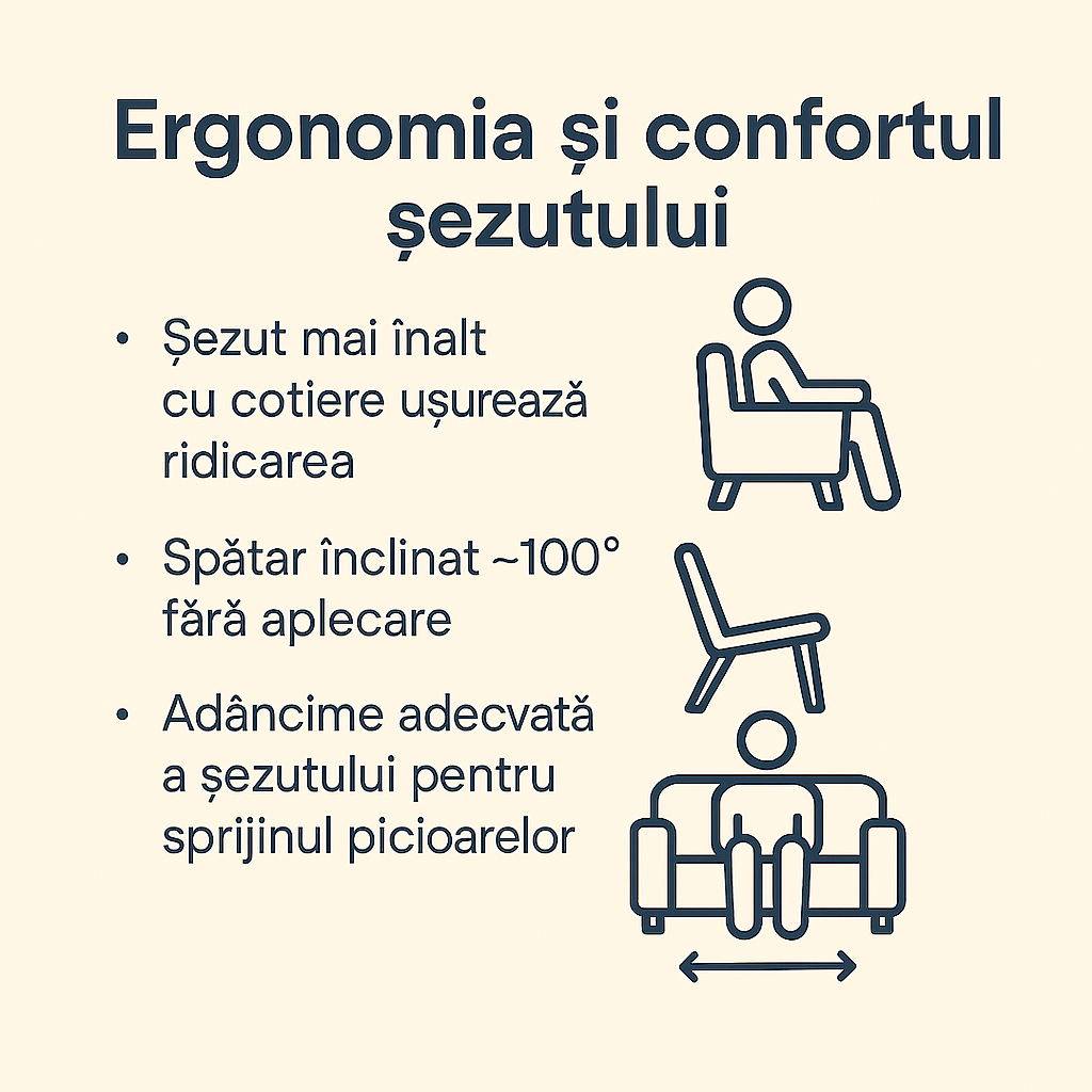 Atunci când vă amenajați camera de zi, trebuie să vă gândiți la ergonomia scaunelor – adică la modul în care canapeaua sau fotoliul sprijină o ședere sănătoasă și confortabilă. Cercetările (Blackler et al., 2018) arată că înălțimea potrivită a scaunului și sprijinul ferm pentru spate și brațe facilitează ridicarea. Prin urmare, un fotoliu puțin mai înalt, cu cotiere, ușurează trecerea din poziția așezat în picioare. Scaunele cu șezut ferm și cotiere fac așezarea mai ușoară. Același sprijin pentru brațe ajută și la ridicare.