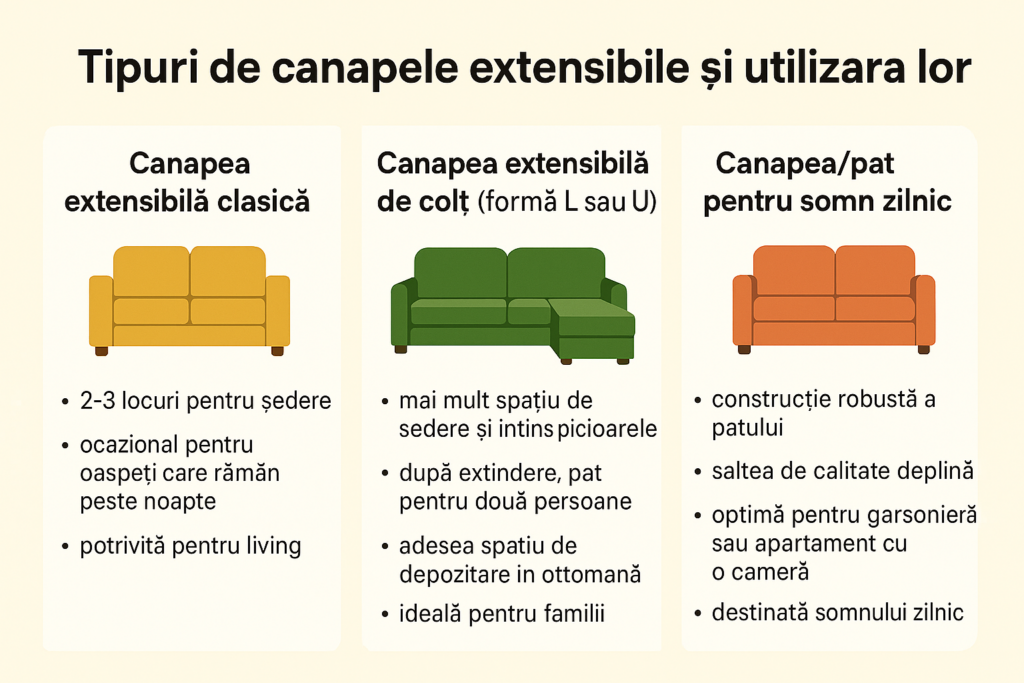 Alege canapeaua extensibilă după modul de folosire: Clasică: potrivită pentru dormit ocazional (musafiri de weekend). Colțar: oferă loc zilnic familiei și pat dublu, la nevoie. Pentru dormit zilnic: recomandată în garsoniere ori apartamente mici, unde înlocuiește patul permanent.