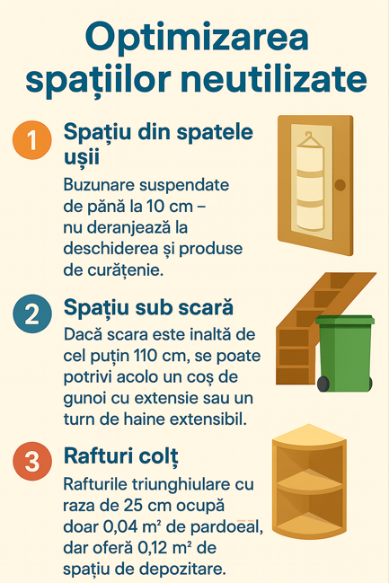 „Punctele moarte” spațiale – spațiile înguste din spatele ușilor, zonele înclinate de sub scări sau colțurile ascuțite ale camerelor – rămân adesea nefolosite pur și simplu pentru că le considerăm prea mici sau nepractice. De fapt, cu soluția potrivită, aceste cavități pot oferi un spațiu de depozitare surprinzător de mare, fără a ocupa spațiu pe podea sau a obstrucționa mișcarea naturală. Cheia este să vă gândiți ce să depozitați în ele (obiecte ușoare, utilizate frecvent, sau provizii sezoniere mai voluminoase) și cum să asigurați accesul ergonomic la ele. În multe cazuri, un buzunar superficial, un turn îngust extensibil sau un raft triunghiular de colț sunt suficiente pentru a transforma un spațiu aparent inutil într-un modul de depozitarea funcțional, reducând în același timp aglomerația vizuală.