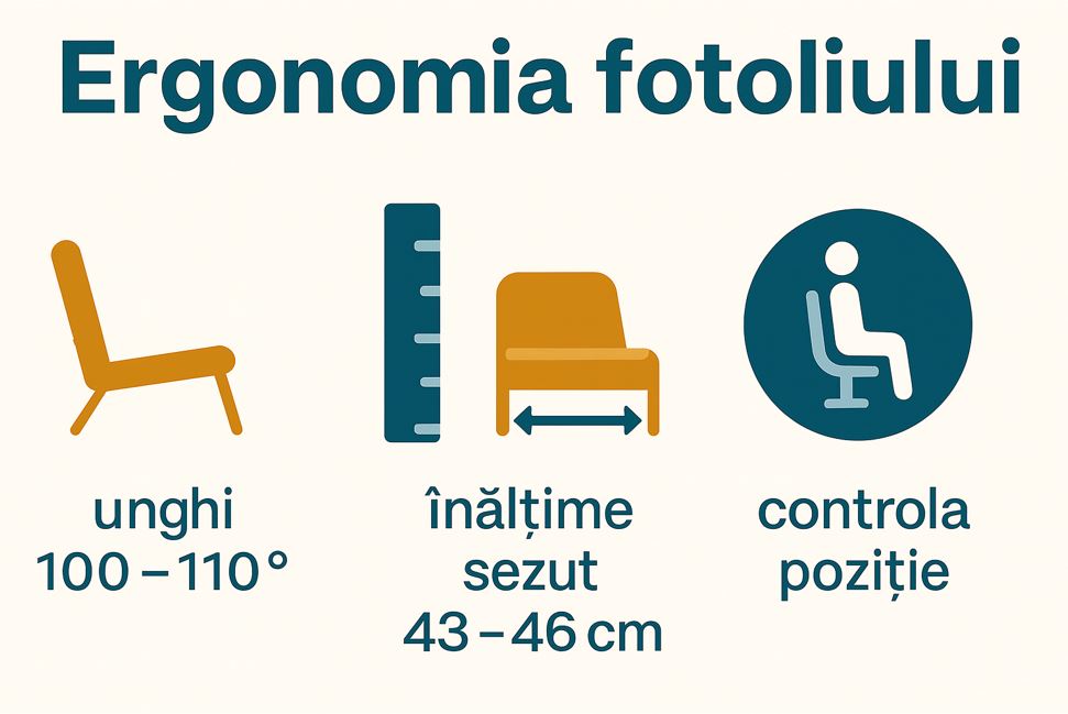 Un fotoliu de relaxare cu spătar reglabil manual sau motorizat reduce presiunea pe zona lombară cu 19 % la un unghi de 135° și îmbunătățește circulația sanguină în membrele inferioare (Hsu & Chen, 2023). Motorul trebuie să aibă o nivel de zgomot sub 50 dB, altfel perturbă confortul acustic al livingului. Fotoliile tip „rocker” cu arcuri favorizează micromișcarea, care stimulează pompa gambieră și reduce edemele, dar necesită o pardoseală netedă, fără covor.