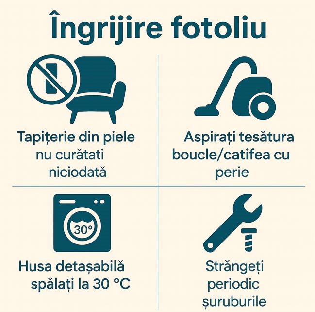 - Întreținere și service – pentru ca fotolii living să arate ca noi și după ani