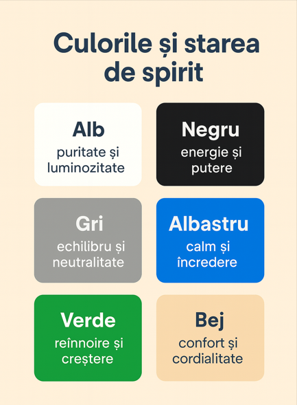 Psihologia culorilor te ajută să alegi mobilierul potrivit atmosferei dorite. Pentru confort și siguranță: canapele bej cu fotolii verde-pastel. Pentru concentrare: covor albastru sau perete verde stins la birou. Pentru un living modern: mobilier gri, accente metalice negre și perne galbene optimiste.