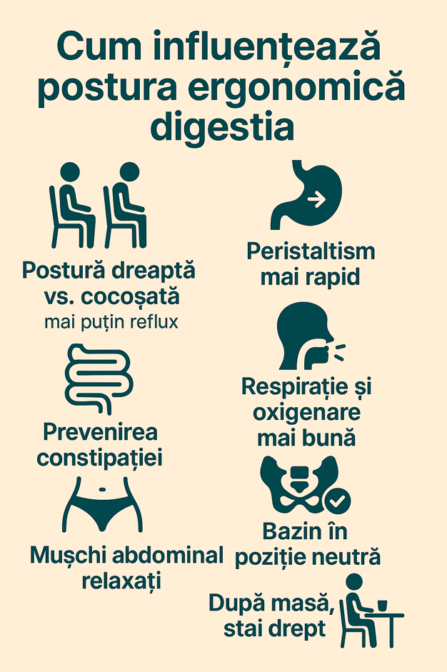 În general, poziția ergonomică a corpului face ca sistemul digestiv să își facă mai ușor treaba. O poziție corectă ajută la menținerea unei bune digestii, prevenind comprimarea stomacului și favorizând ritmul natural al intestinelor. Deși nu este o soluție universală pentru indigeste, o postură adecvată poate contribui la o senzație mai bună după masă. Dacă ați simțit vreodată arsuri sau disconfort din cauza unei poziții incorecte, este un semn că postura contează. Un scaun confortabil și o poziție corectă pot face diferența pentru o digestie mai ușoară.