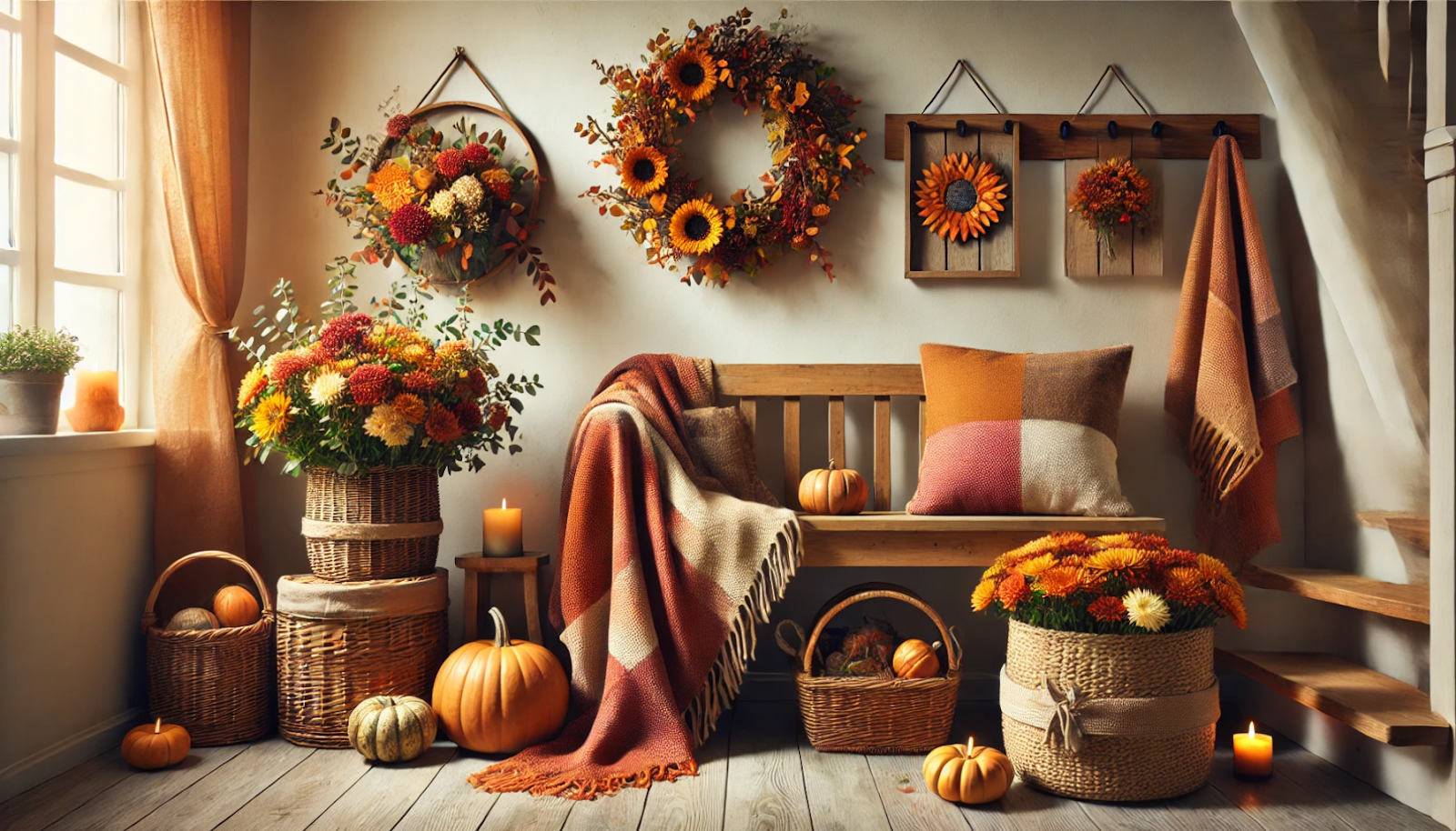 Decorațiuni de toamnă fără dovleci pur și simplu nu ar fi completă. Alegeți dovleci de diferite dimensiuni și culori – de la portocaliul clasic la alb sau verde – și aranjați-i în coșuri de răchită. Plasați aceste coșuri lângă un suport pentru pantofi sau pe o bancă pentru a întâmpina oaspeții imediat ce intră.