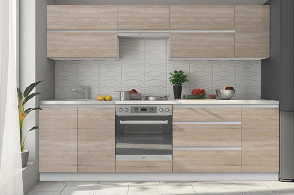 - Dulapuri fără mâner cu finisaj mat și elemente din lemn pentru a atenua aspectul.