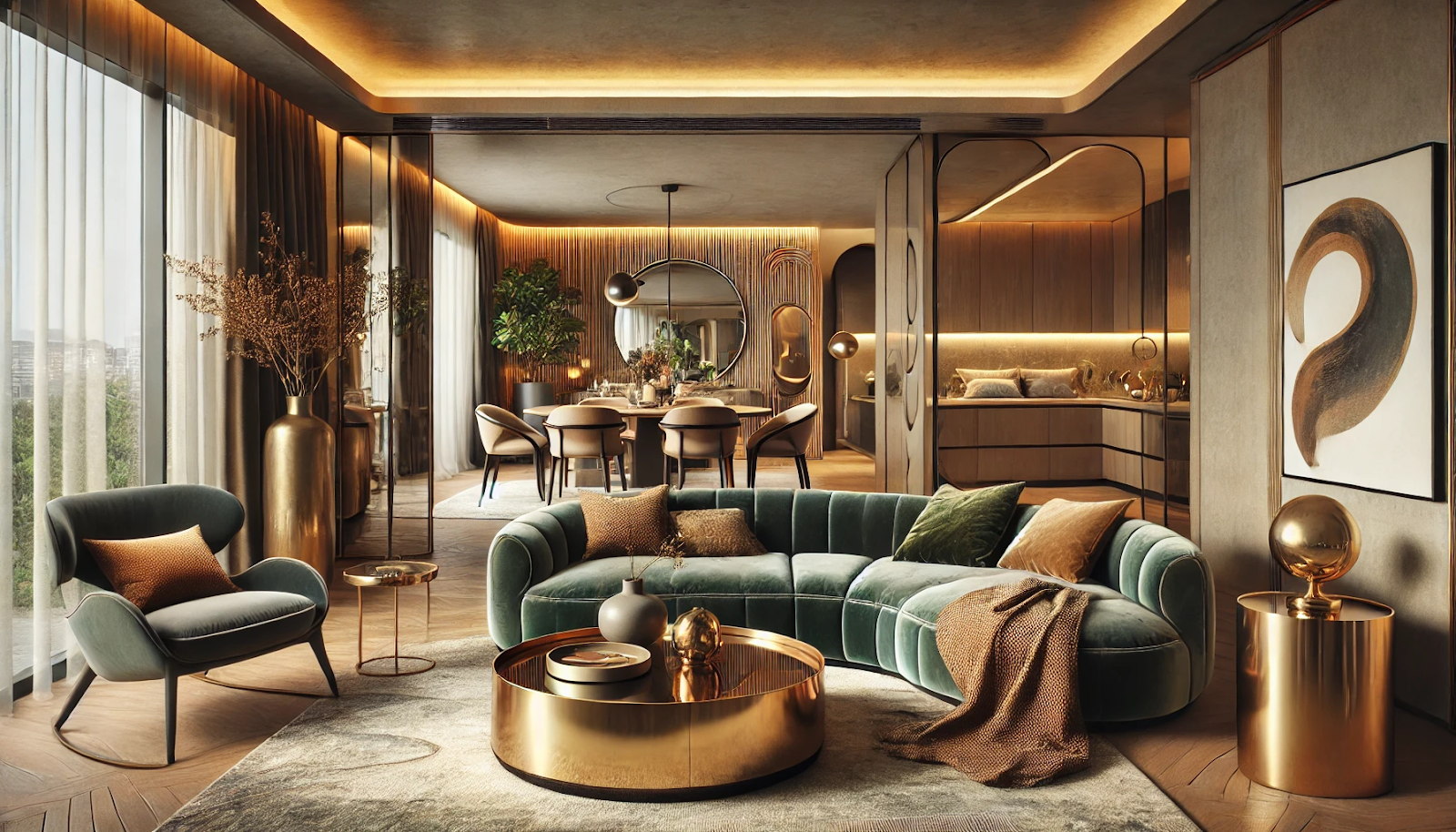 Spațiile de zi capătă linii mai moi, texturi naturale și contraste cu accente îndrăznețe în noul an. Formele rotunjite ale canapelelor și fotoliilor conferă camerei o atmosferă primitoare, în timp ce combinația de elemente din lemn și metal aduce o notă modernă. Iluminatul de ambianță joacă, de asemenea, un rol important, susținând confortul spațiului.
