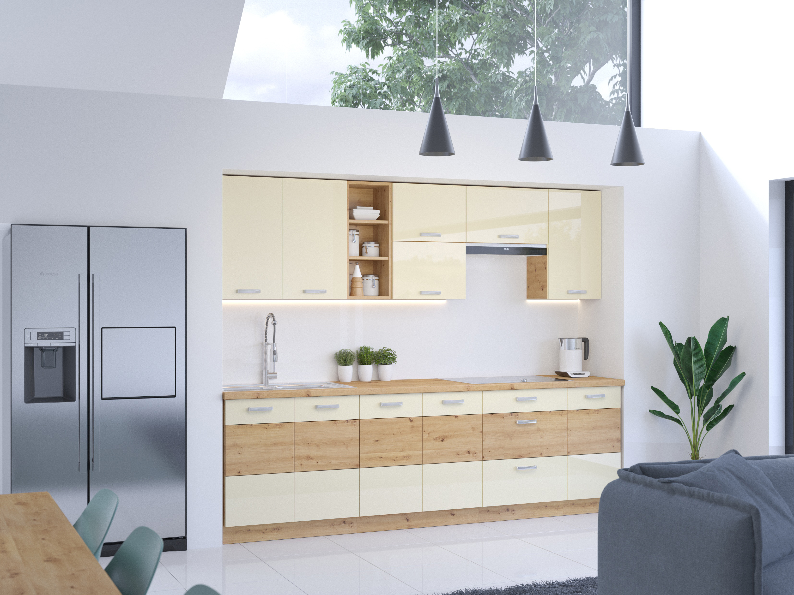 Bucătărie Arryn 1 (stejar artisan + crem)