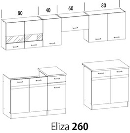 Bucătărie spațioasă, realizată într-un stil modern și atrăgător format din 7 dulapuri. Lățimea bucătăriei este de 260 cm, astfel find potrivită pentru o bucătărie pe dimensiuni mai mari. Recomandăm și achiziția unui organizator de tacâmuri pentru sertare.