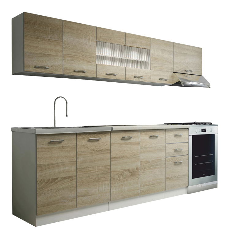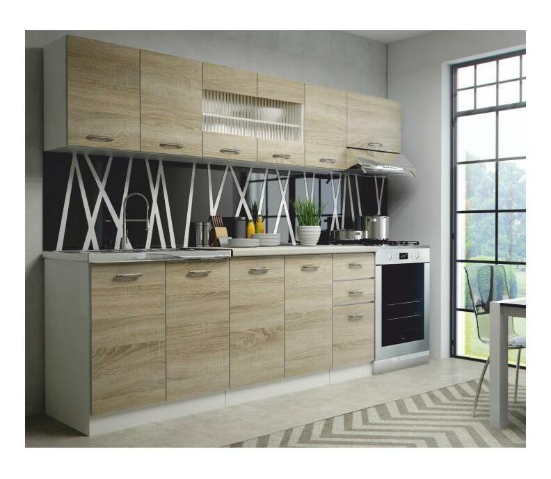 Apartamentele mai mici au nevoie de bucătării mai mici. Designul lor nu poate fi în detrimentul prețurilor. Aducem în atenția dvs. o bucătărie la un preț avantajos. Lățimea părții superioare a dulapului de bucătărie împreună cu cea a hotei este de 260 cm, iar lățimea părții inferioare este de 200 cm. Este realizată din pal laminat de calitate. Dulapurile sunt în versiunea color a stejarului sonoma, iar corpul mobilei este de culoare albă. Masca de chiuvetă este livrată fără blatul de lucru, de aceea vă recomandăm să cumpărați o chiuvetă universală în magazinul nostru. Bucătăria este livrată fără aparate.