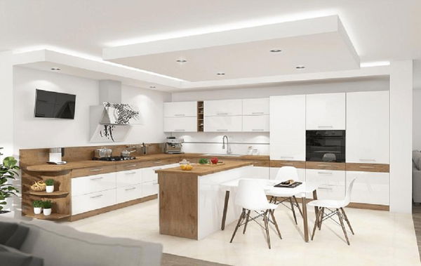 Bucătăria Velaga 59, în combinație cu o suprafață albă lucioasă și stejar lancelot, aduce un design modern combinat cu o eleganță atemporală. Materialele prelucrate cu precizie garantează durabilitate și viață lungă, în timp ce spațiile de depozitare concepute practic oferă suficient spațiu pentru organizarea ustensilelor de bucătărie. Suprafețele lucioase adaugă o notă subtilă de lux, în timp ce aspectul natural al stejarului creează un contrast armonios și stilat. Această bucătărie îmbină perfect funcționalitatea și estetica, ideală pentru gospodăriile moderne.