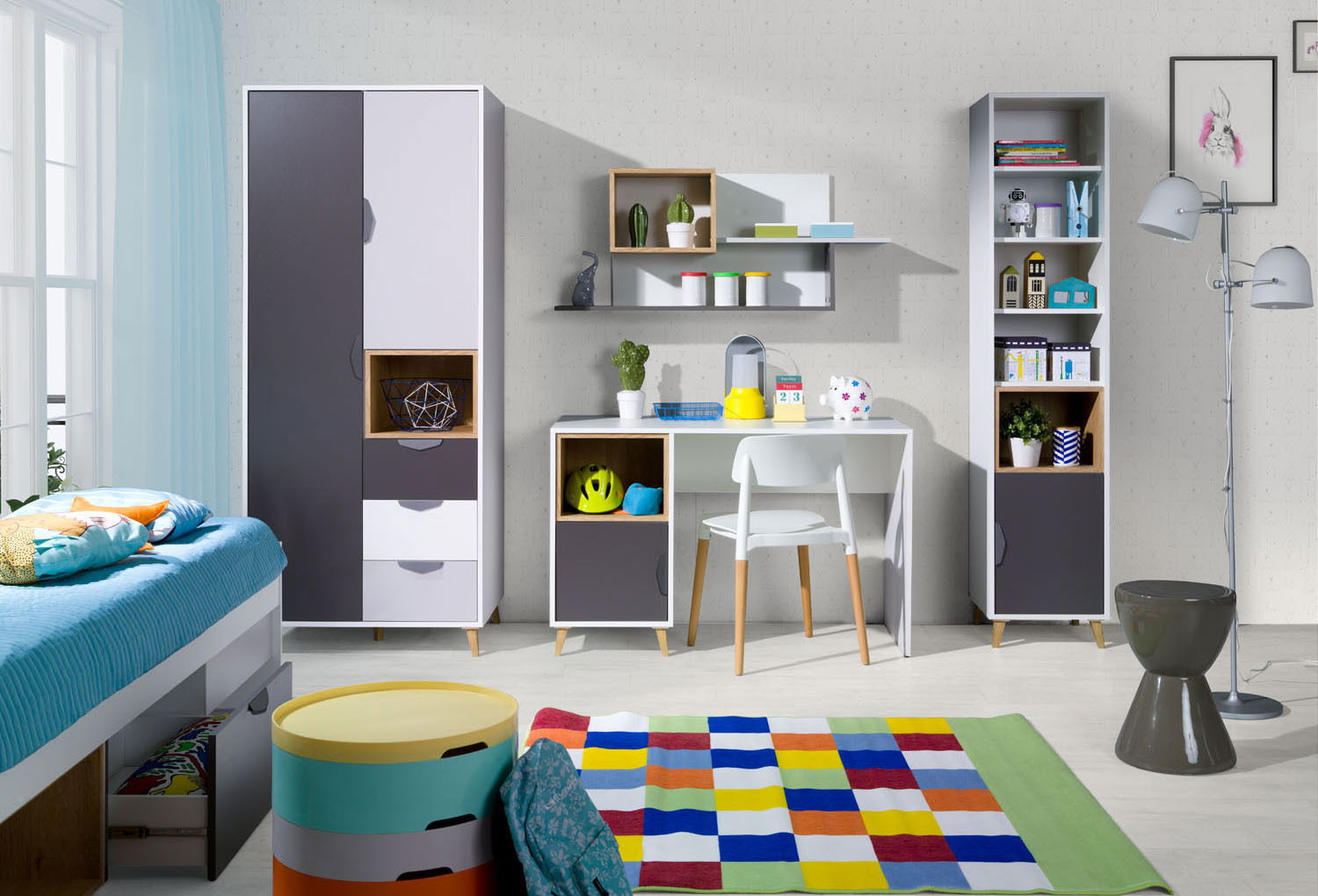 Camera copiilor Juna 6 este un spațiu modern și funcțional care îmbină estetica cu utilizarea practică. Combinația de culori elegante alb, grafit, gri și nuanța caldă a stejarului Lefkas creează o atmosferă armonioasă, ideală pentru activitățile creative și relaxare ale copiilor. Echipamentul camerei include o bibliotecă, o bibliotecă, un raft de perete și o masă pentru PC, care oferă mult spațiu de depozitare și organizare de sprijin. Această cameră este alegerea perfectă pentru părinții care caută o soluție elegantă și practică pentru cei mici.