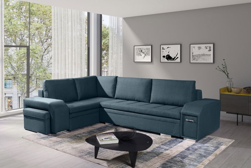 AfișeazăCanapeaua pe colț Aja are ascuns într-una dintre cotiere un minibar, iar în cealaltă un otoman. Canapeaua este extensibilă, cu spațiu de depozitare.