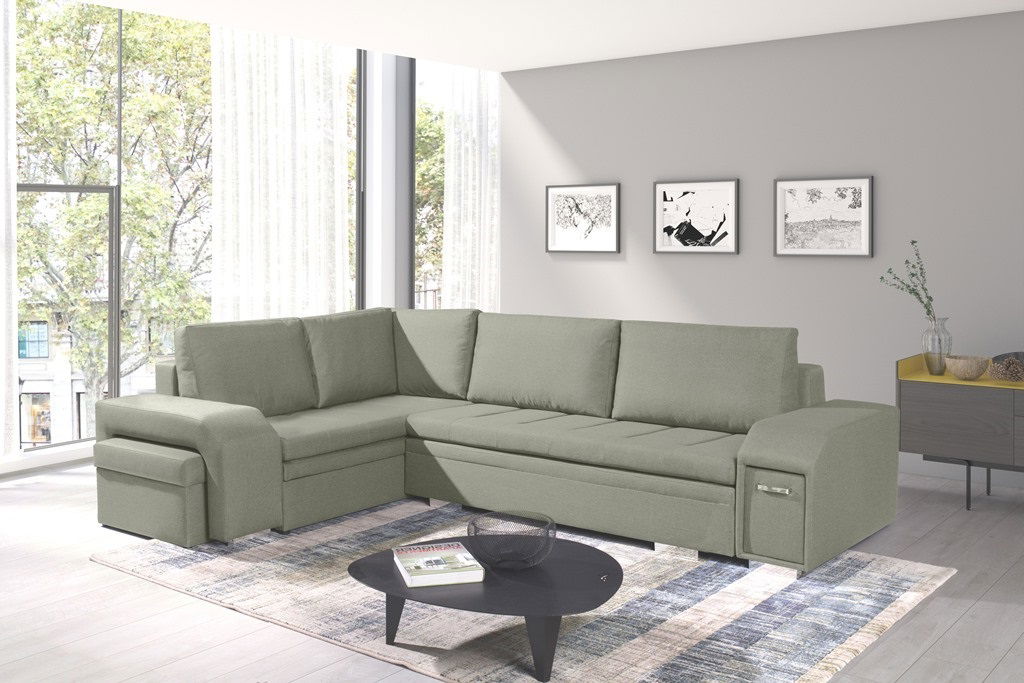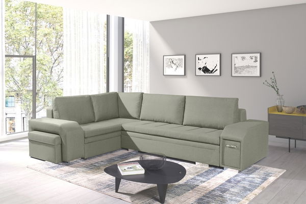 AfișeazăCanapeaua pe colț Aja are ascuns într-una dintre cotiere un minibar, iar în cealaltă un otoman. Canapeaua este extensibilă, cu spațiu de depozitare.