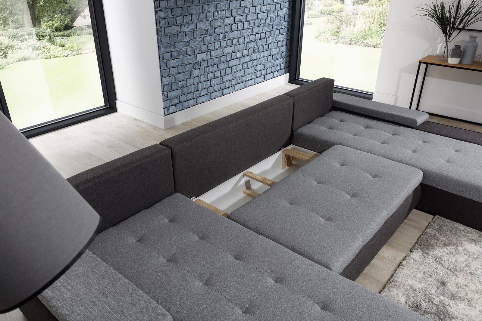 AfișeazăColțar în formă de U Marino are dimensiuni de 363x200x80 și este ideal pentru camere de zi mai mari și pentru designerii de case care doresc să amenajeze interiorul într-un mod elegant și confortabil. Aspectul în formă de U îi conferă eleganță. Șezutul este din arcuri și spumă T30, oferind astfel un confort maxim. Colțarul oferă spațiu de dormit și spațiu de depozitare.