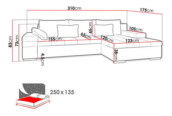 lungime: 310 cm,lățime: 175 cm,înălțime: 83 cm,suprafața de dormit: 250 x 135 cm