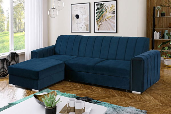 Colțarul Ricky, tapițat într-un albastru închis profund, este piesa recomandată pentru livingul tău modern, combinând funcționalitatea unei canapele extensibile cu un design sofisticat.