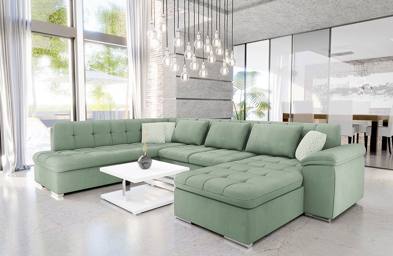 Cadru din lemn + pal; Spumă poliuretanică; Arc ondulat; Funcție de extindere; Cu spațiu de depozitare; Picioarele din față din plastic (crom) / picioarele din spate din plastic (negre); Spătarul este sub forma de perne; Pernele au fermoar; Pernele sunt incluse în preț; Partea din spate a canapelei este tapițată.