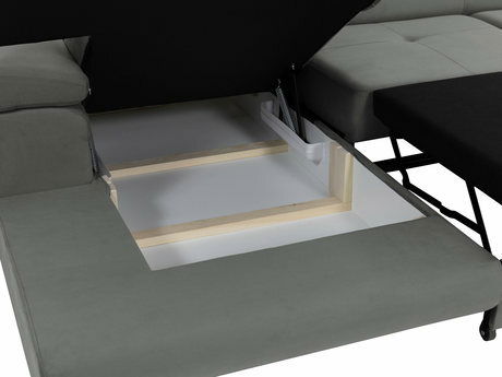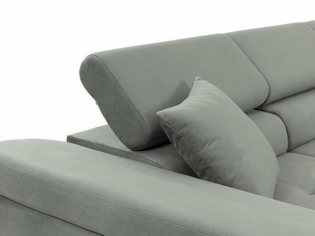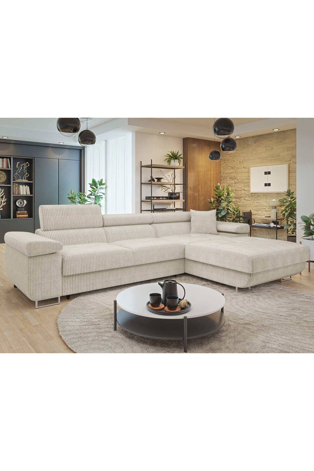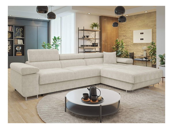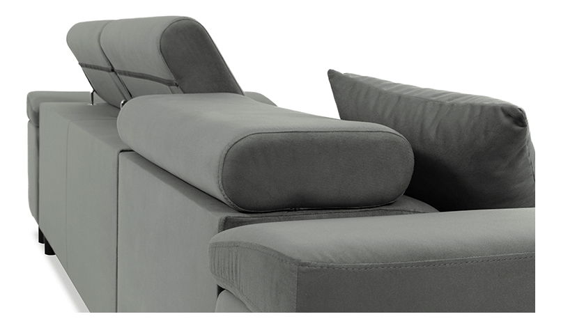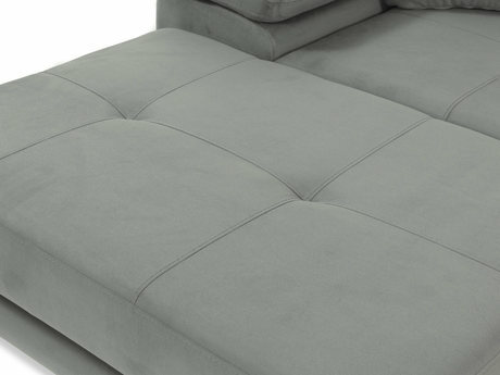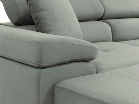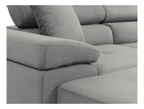 - Picioarele metalice discrete și opțiunea de poziționare pe partea dreaptă facilitează integrarea colțarului în diverse amenajări, de la apartamente mici până la camere generoase.