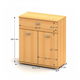 Comodă universală cu două uși și un sertar, care poate fi plasată în mai multe tipuri de camere și poate să dețină mai multe roluri de stocare. Materialul este din PAL de lemn laminat cu structură internă mai groasă în versiunea color de fag, iar în interior în spatele ușilor se află un singur raft.