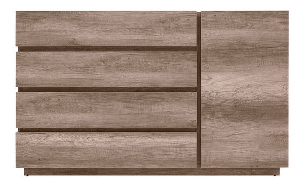 Un design natural superb al acestei comode din imitația lemnului, vă va fascina cu siguranță încă de la prima vedere. Comoda are o ușă și patru sertare mai largi. Ușa și sertarele nu au mânere, ceea ce exprimă mai tare designul ei minimalist.