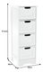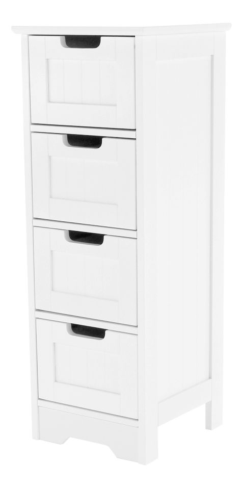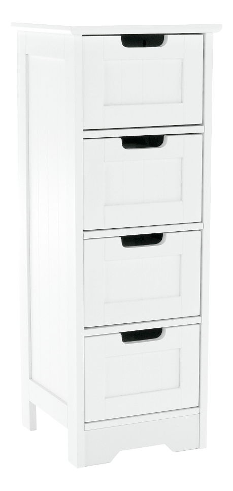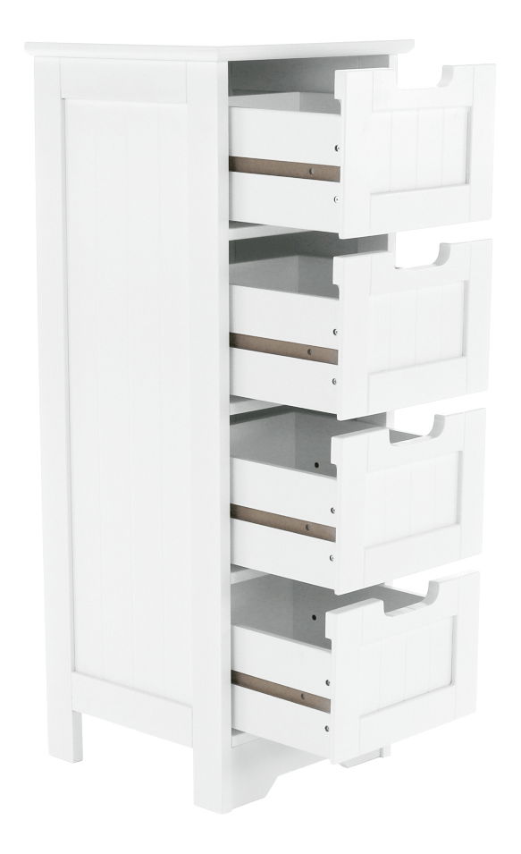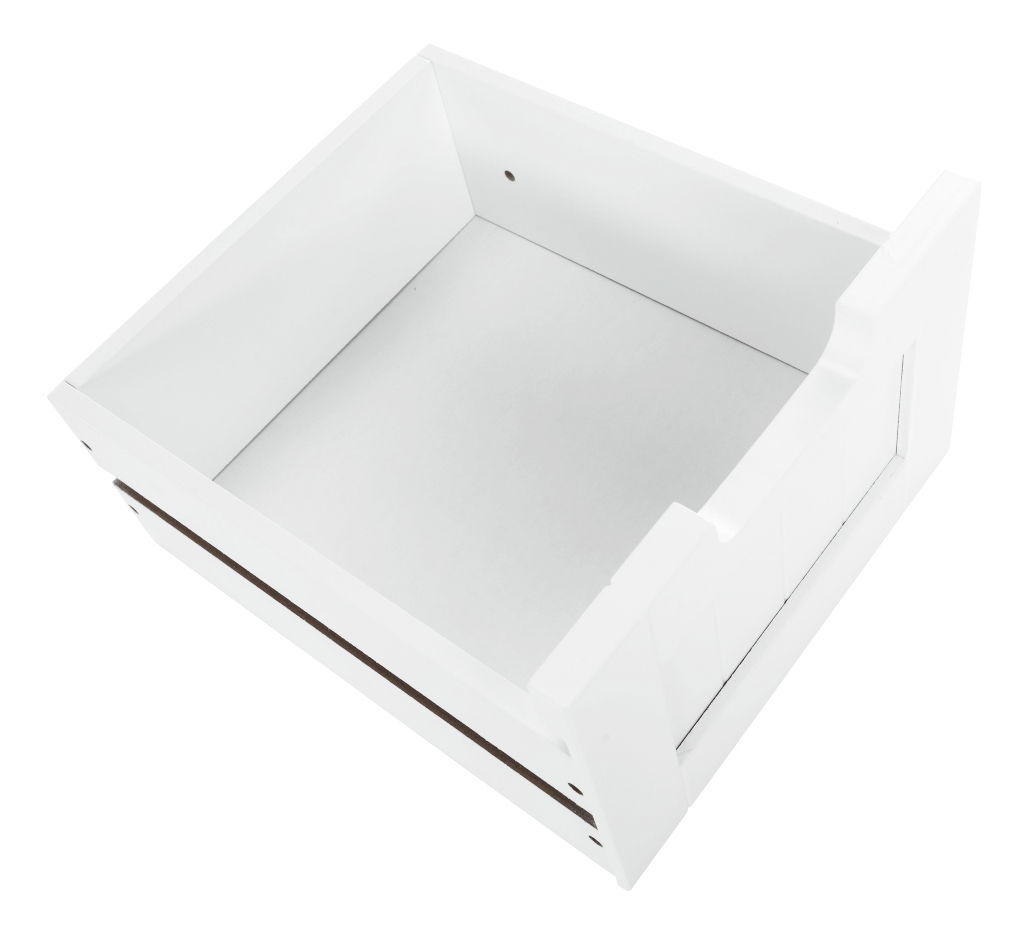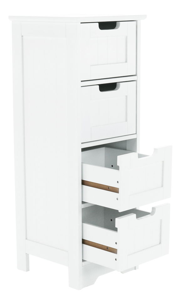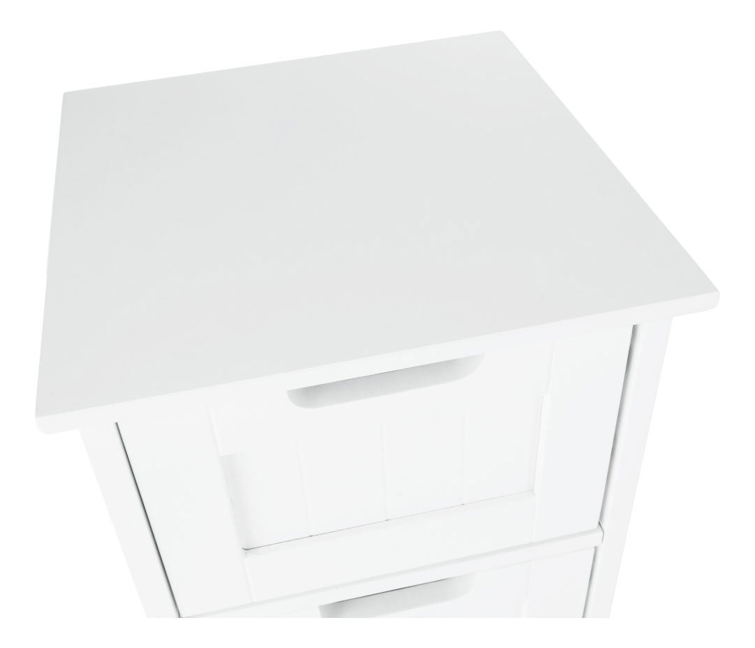 - Design simplu, alb, cu sertare prevăzute cu mânere decupate