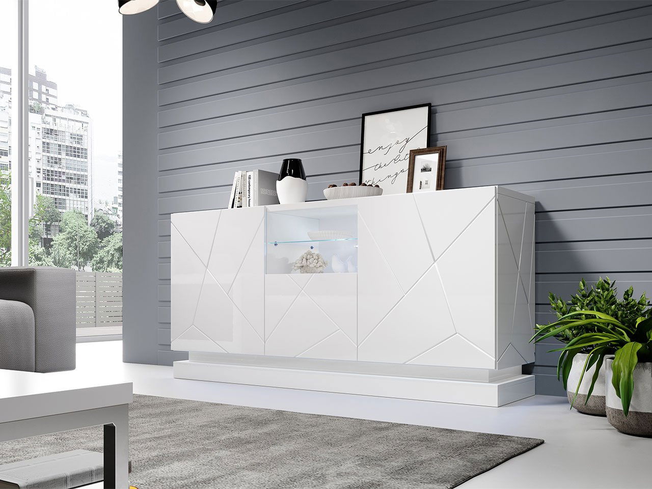 Comoda Aura 2D1K în alb lucios aduce un aer modern și rafinat în orice living sau sufragerie. Designul său geometric, cu linii intersectate, transformă această comodă într-un element central al încăperii, captând atenția și completând armonios decorul contemporan. Finisajul lucios adaugă luminozitate, făcând spațiul să pară mai amplu și primitor.
