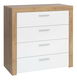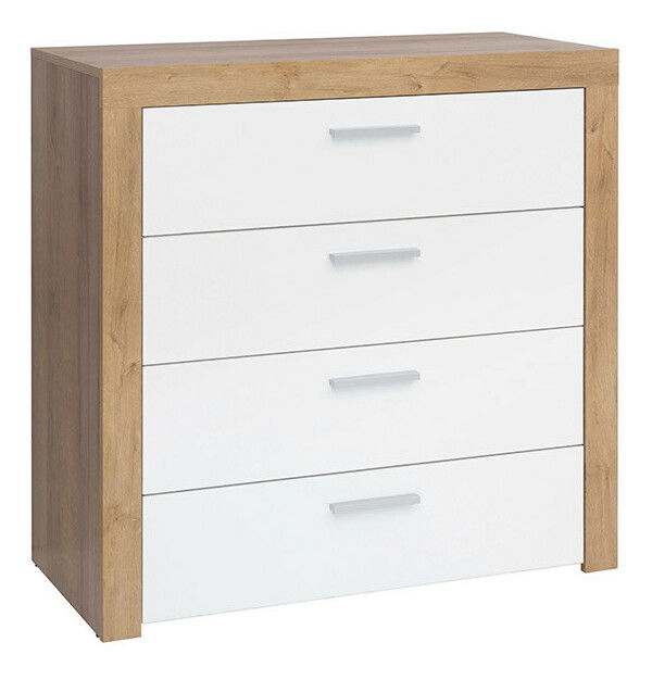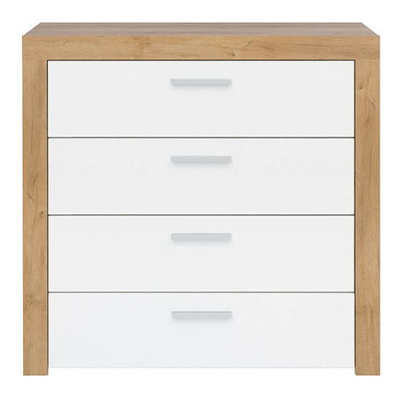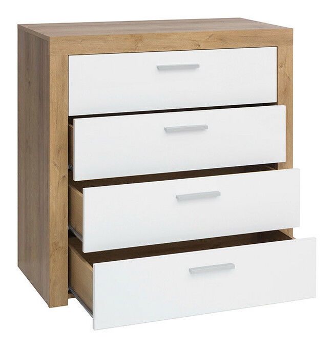 AfișeazăO comodă cu patru sertare potrivită pentru dormitor , hol sau camera de zi. Un design simplu și culorile plăcute se încadrează în orice casă modernă. Comoda are patru sertare în care vă puteți depozita îmbrăcămintea, lenjeria de pat sau alte accesorii. Sertarele se deschid cu ajutorul mânerelor mai subțiri și alungite.