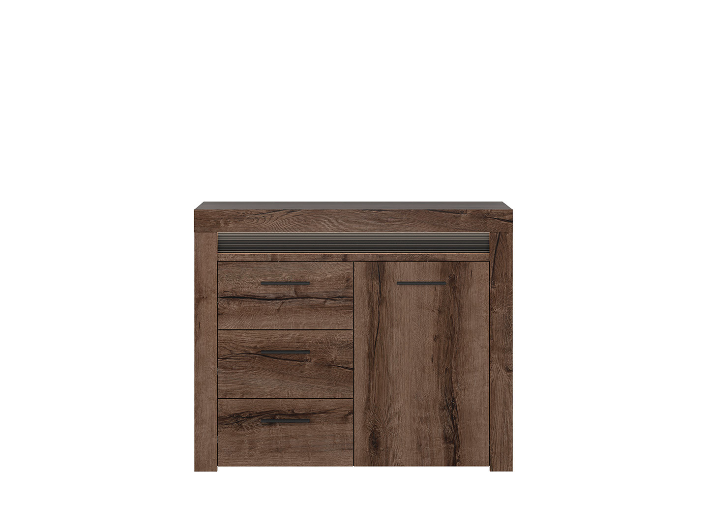 Comodă elegantă într-un design atractiv pe versiune color închisă cu sculptură distinctivă din lemn. Comoda conține trei sertare și un dulap. Fiecare dulap conține un raft. Ușile și sertarele se deschid cu ajutorul mânerelor alungite subțiri.