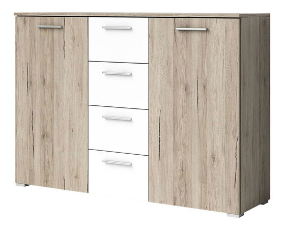 AfișeazăÎn cazul în care aveţi nevoie de spaţiu mai mare în casă, comoda este soluţia ideală. În mijloc se află patru sertare practice și pe părţi sunt puse dulapurile. În fiecare dintre ele se află o poliţă. Mânerele mai largi vă ajută să deschideţi mai ușor sertarele, dulapurile și în plus oferă un design elegant al comodei.