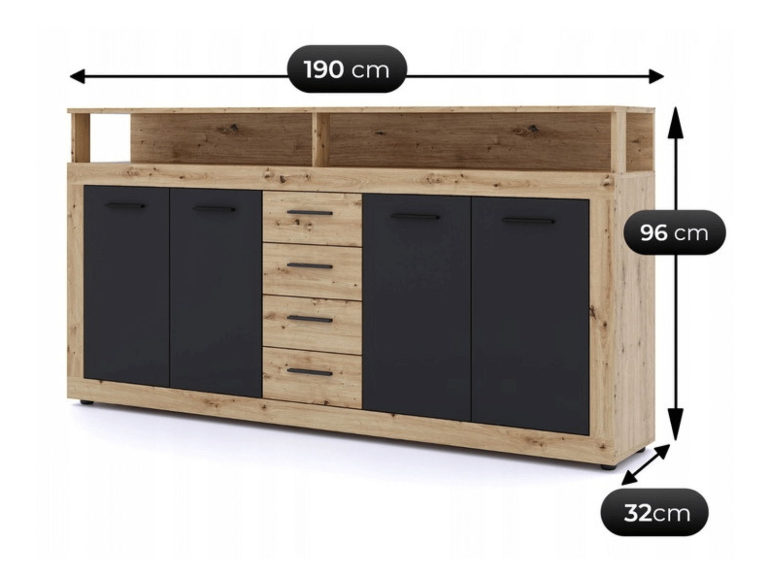 Designul modern, ce combină textura naturală a lemnului cu accentele negre matte, se integrează cu ușurință în multiple stiluri de interior — de la minimalist la industrial, de la scandinav la urban chic. Comoda poate completa armonios o sufragerie cu mobilier modular, dar și un spațiu de birou sau dormitor. Finisajele rezistente și mânerele discrete fac din acest model o alegere durabilă, ușor de întreținut.