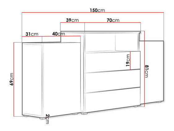 - Trei sertare spațioase și două uși laterale oferă loc generos pentru depozitarea obiectelor, menținând ordinea și organizarea spațiului.