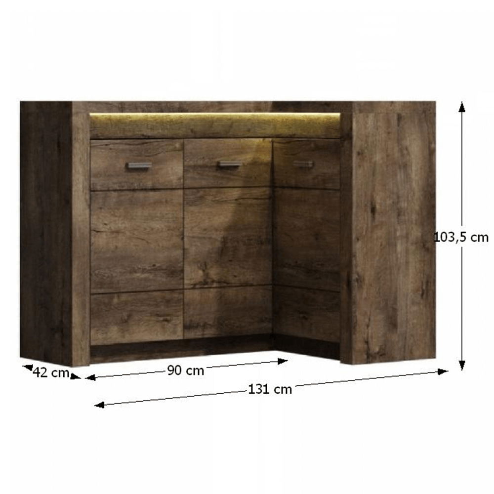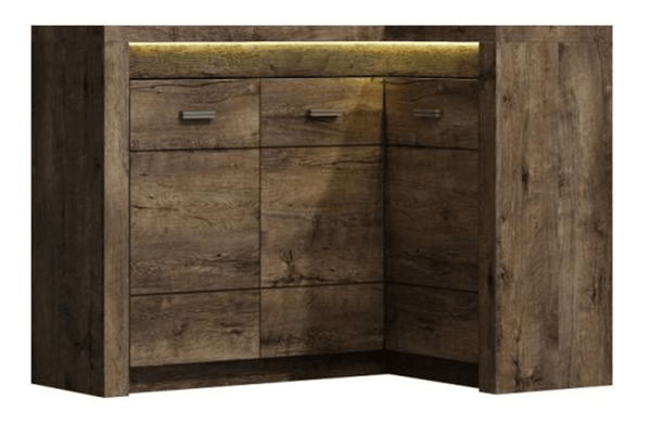 Comodă de colț din colecția de lux de mobilier de înaltă calitate și cu design modern. Comoda este la alegere pe mai multe versiuni color și este potrivită pentru camera de zi sau sufragerie. Cadrul are grosime de până la 48mm cu mânerele metalice. Posibilitate de a comanda și iluminat LED.