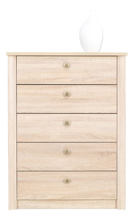 AfișeazăComoda cu sertare poate fi folosită în mai multe moduri. Tacâmurile în sufragerie, lenjeria de pat în dormitor, depozitarea documentelor în camera de lucru sau în camera de zi. Cinci sertare oferă suficient spațiu de depozitare și de asemenea, veți avea lucrurile sortate frumos. Pe partea superioară a comodei puteți așeza obiectele decorative. Pe margini sunt așezate plinte decorative.