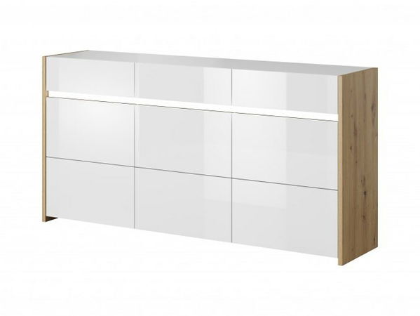 Gama de modele GUBI va aduce o notă de Scandinavia în casa voastră. Acest lucru se datorează combinației plăcute de culori de alb și stejar artizanal. Comoda lată are trei sertare superioare, trei uși și trei rafturi. Avantajul mobilierului este că iluminatul cu LED este deja inclus în preț. Mobilierul este fabricat din PAL cu margine de protecție ABS.