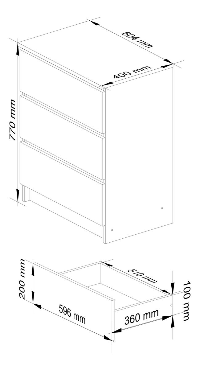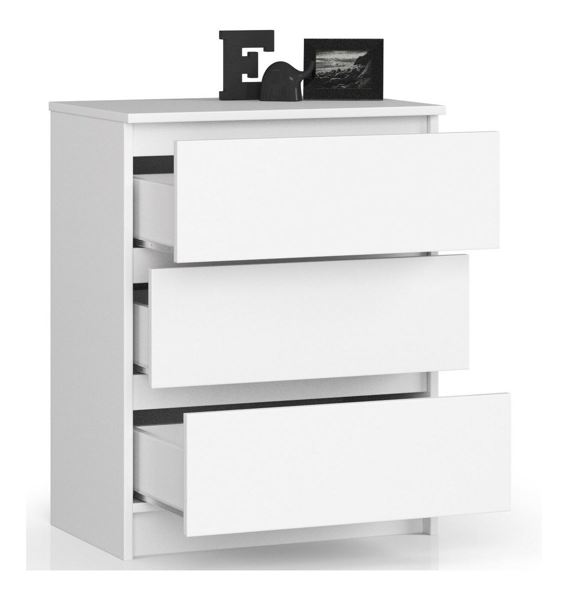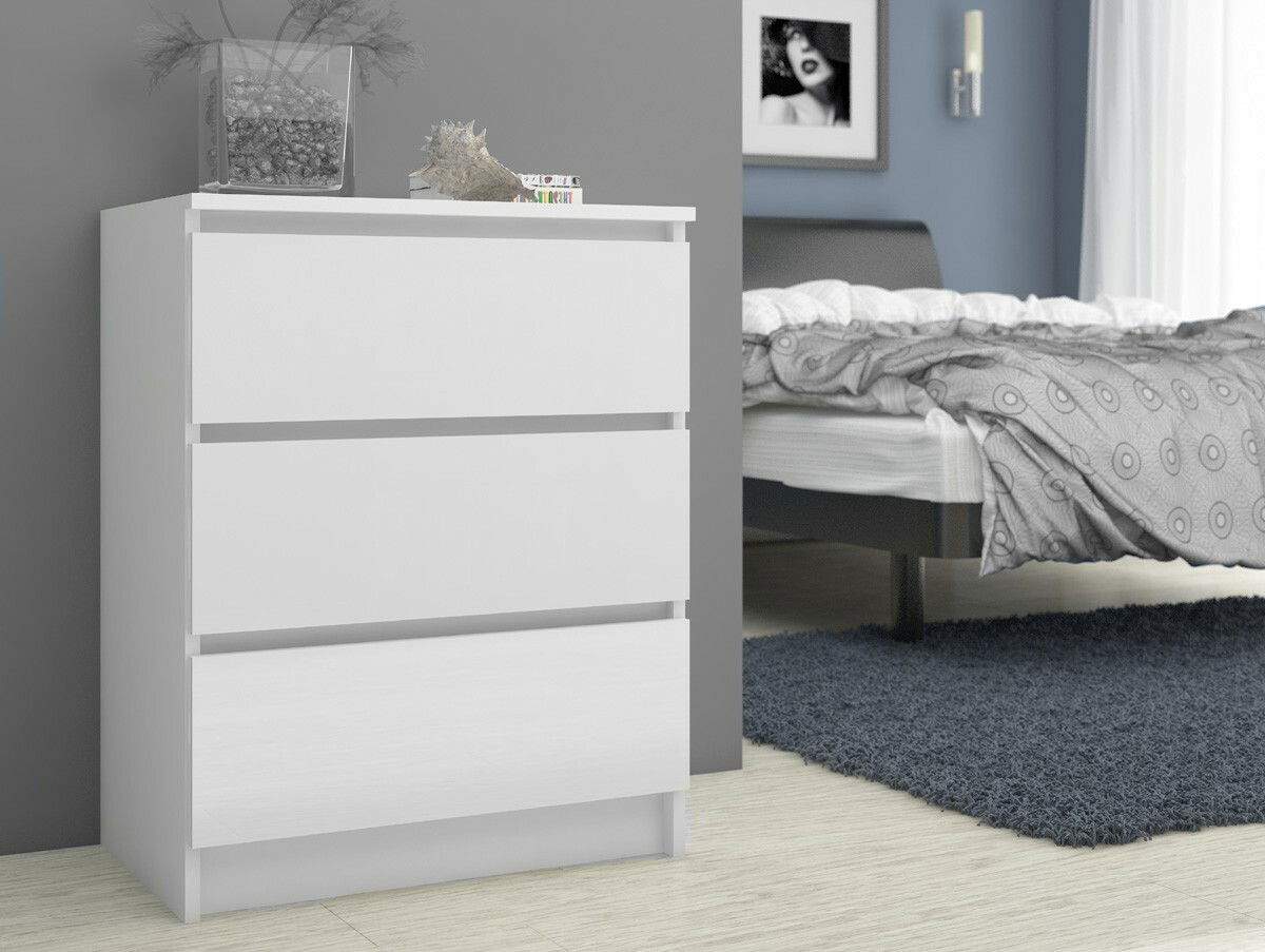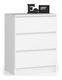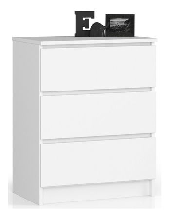 Comoda Kalista II, finisată într-un alb pur, este ideală pentru optimizarea spațiului în orice locuință modernă. Cu dimensiuni compacte de 77 cm înălțime, 60 cm lățime și 40 cm adâncime, acest corp de mobilier oferă trei sertare spațioase, perfecte pentru organizarea hainelor, accesoriilor sau obiectelor personale.