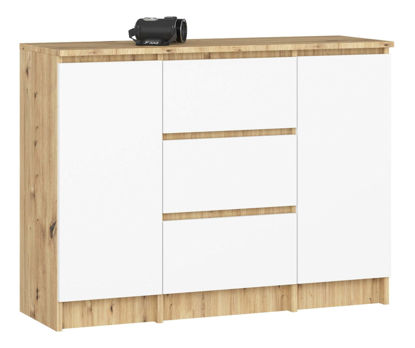 Comoda Kalista VI, cu finisaj în nuanță de stejar artisan combinată armonios cu alb, este soluția ideală pentru orice spațiu care necesită un plus de organizare și stil. Designul său modern și liniile simple fac din acest corp de mobilier o piesă versatilă, potrivită atât în living, dormitor, cât și în hol sau birou.
