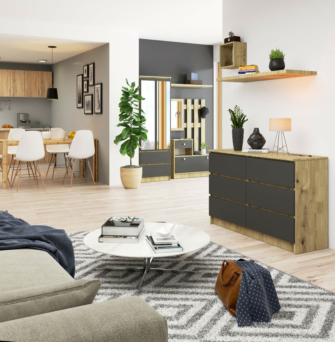 Comodă Kapil (Stejar artisan + Gri)