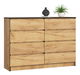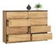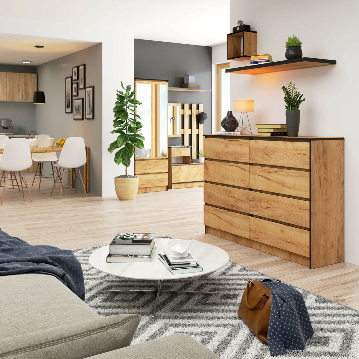 Comoda Keanu III, realizată din stejar craft, combină perfect funcționalitatea cu estetica naturală. Cu dimensiuni generoase de 99 cm înălțime, 138 cm lățime și 40 cm adâncime, această piesă de mobilier oferă spațiu amplu pentru depozitare, ideală pentru organizarea hainelor, lenjeriilor sau accesoriilor.