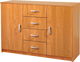 AfișeazăComodă elegantă din trei elementePe părțile laterale există dulapuri cu o ușă și 4 sertare în mijloc. Aceasta vine în versiunea colorată a lemnului de fag și arin.