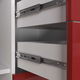 Contrastul plăcut dintre structura albă și fronturile roșii completează amenajarea cu o notă fresh și vibrantă.