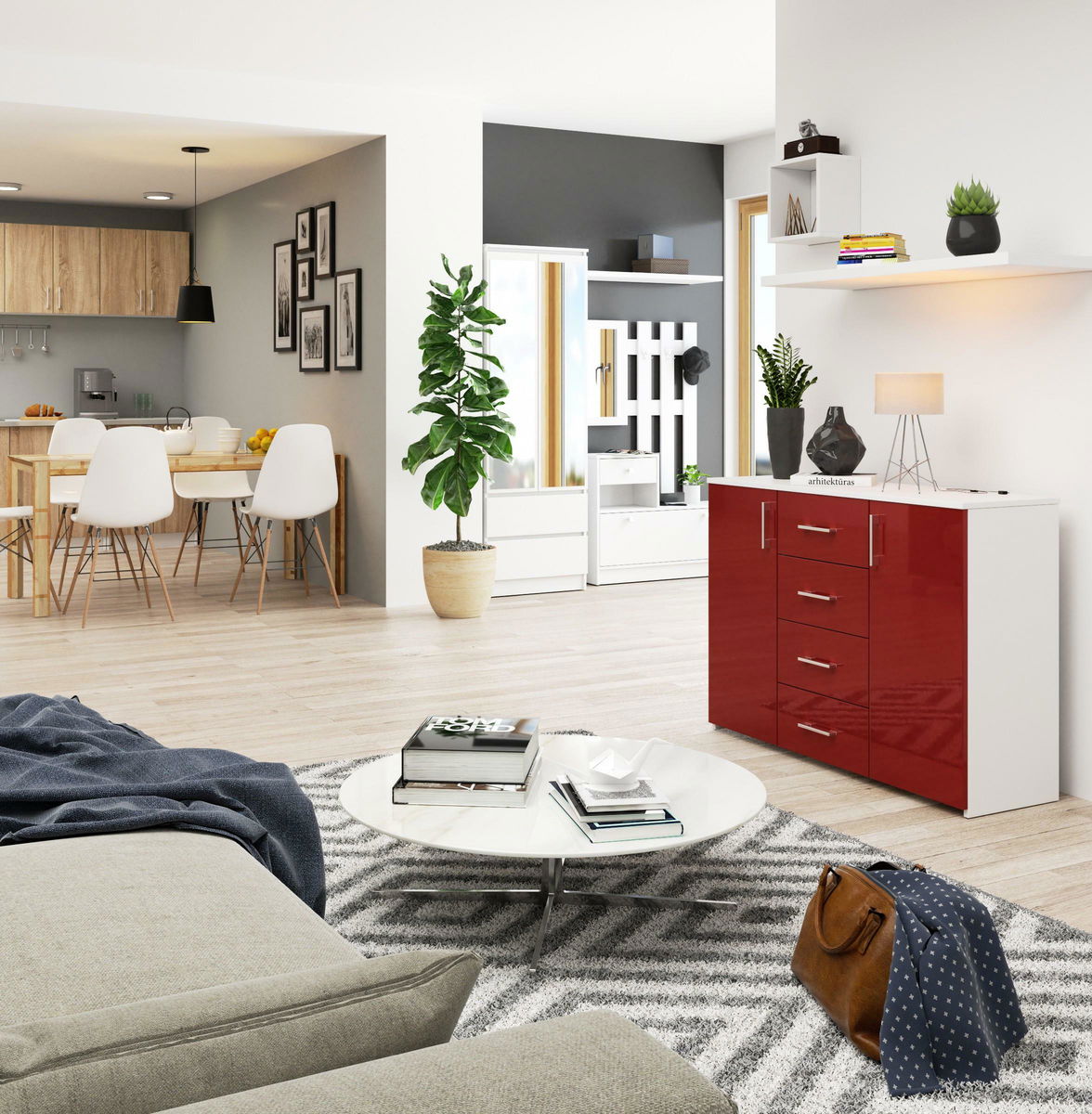 Comoda Kiran în nuanța roșu lucios aduce un strop de culoare și modernitate în interiorul locuinței tale. Cu un design contemporan, finisajul lucios al ușilor și sertarelor transformă această piesă de mobilier într-un element decorativ ce atrage privirile și adaugă dinamism spațiului.