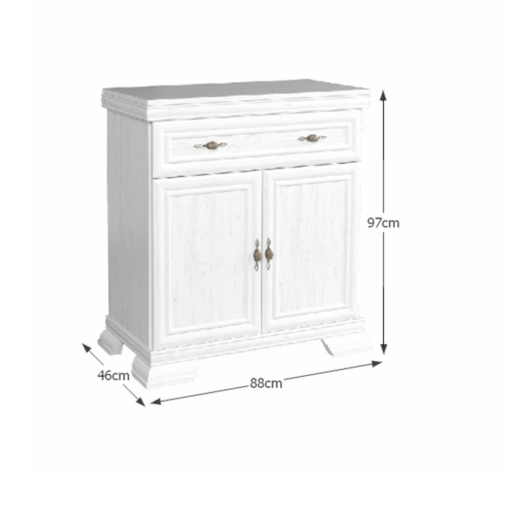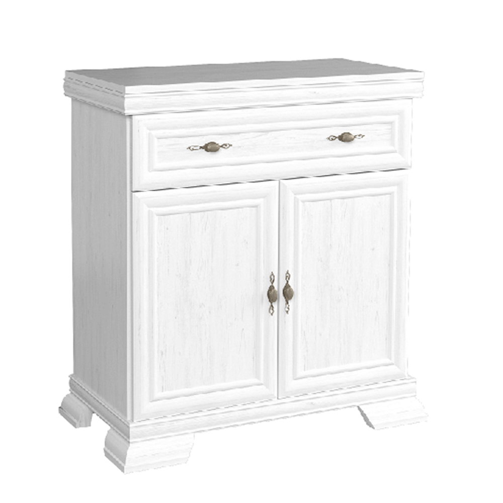 Comoda masivă rustică Kraz cu sertar și uși. Cu ea vă veți putea mobila atât sufrageriile sau camerele de zi cât și dormitoarele sau camerele de lucru. Are picioare și plinte sculptate decorativ. Sertarul și ușa au mânere din metal. Este livrată într-o versiune elegantă a pinului andersen.