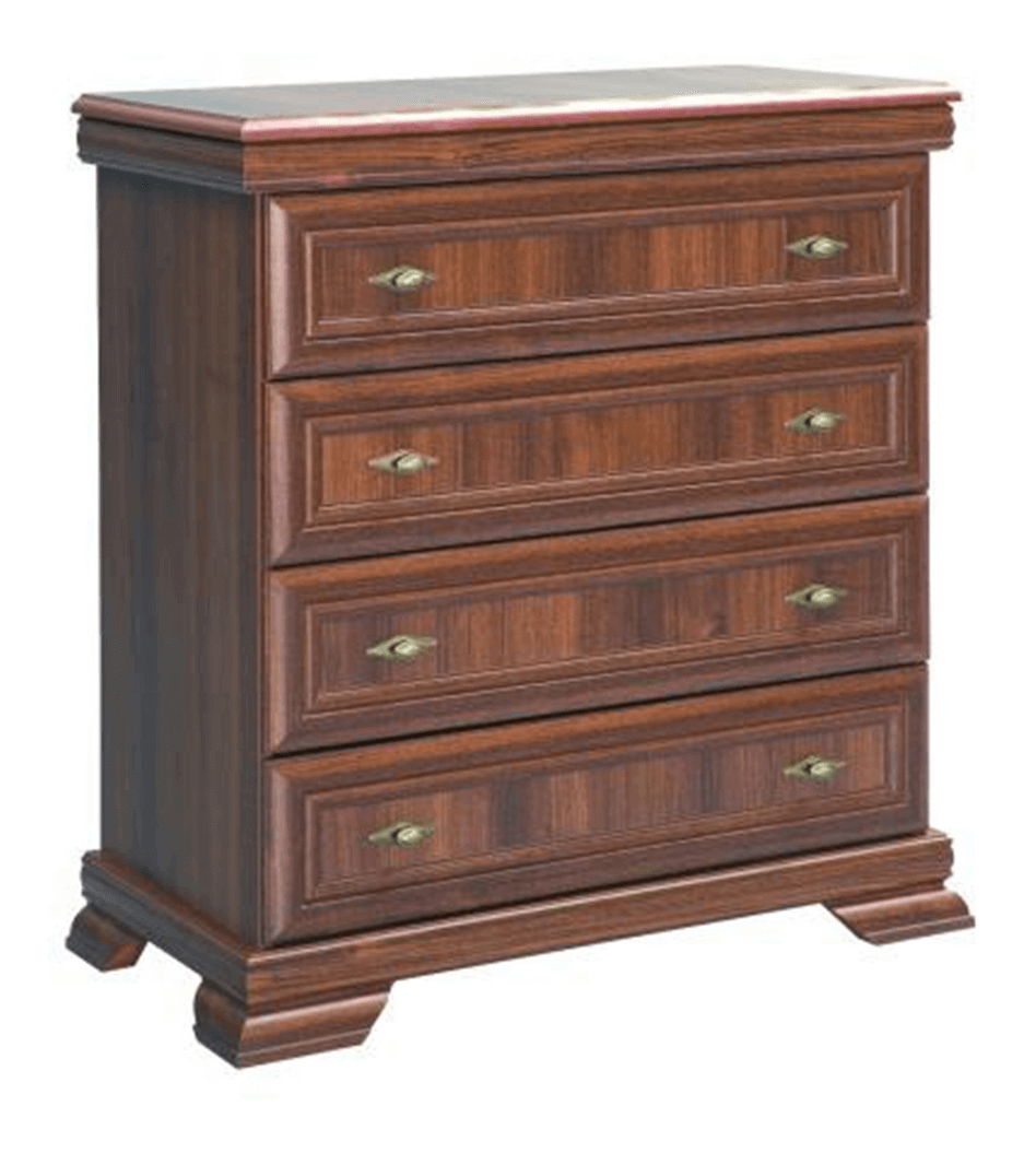 Comoda Kraz masivă cu caracter rustic și patru sertare. Are picioare și plinte sculptate decorativ. Sertarele au mânere din metal. Este fabricată din combinația de pal și MDF. Comoda este în versiunea color a pinului andersen.