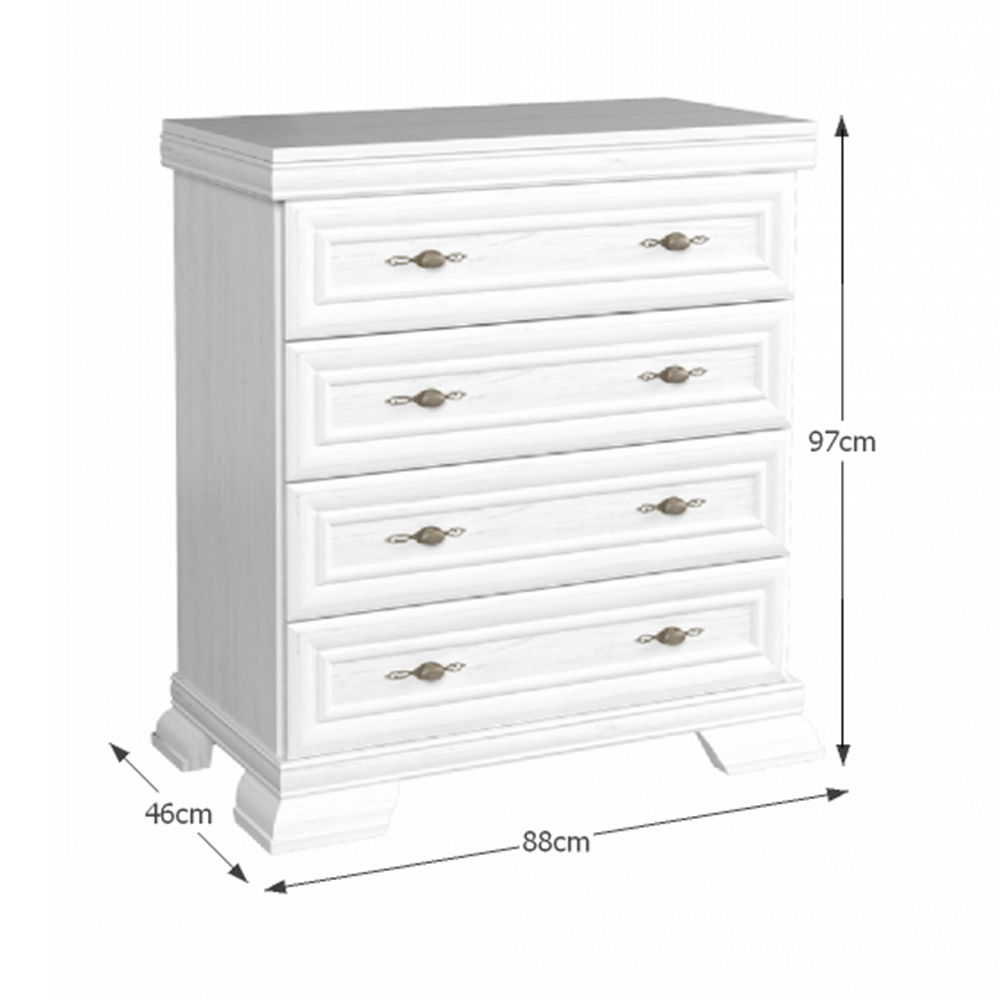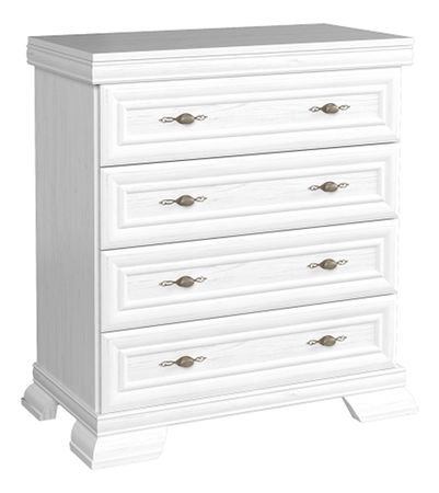 Comoda Kraz masivă cu caracter rustic și patru sertare. Are picioare și plinte sculptate decorativ. Sertarele au mânere din metal. Comoda este în versiunea color a pinului andersen.