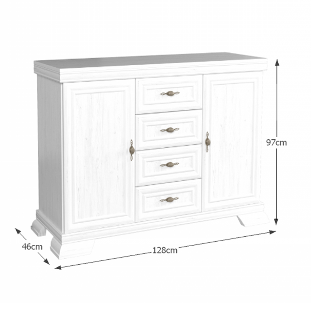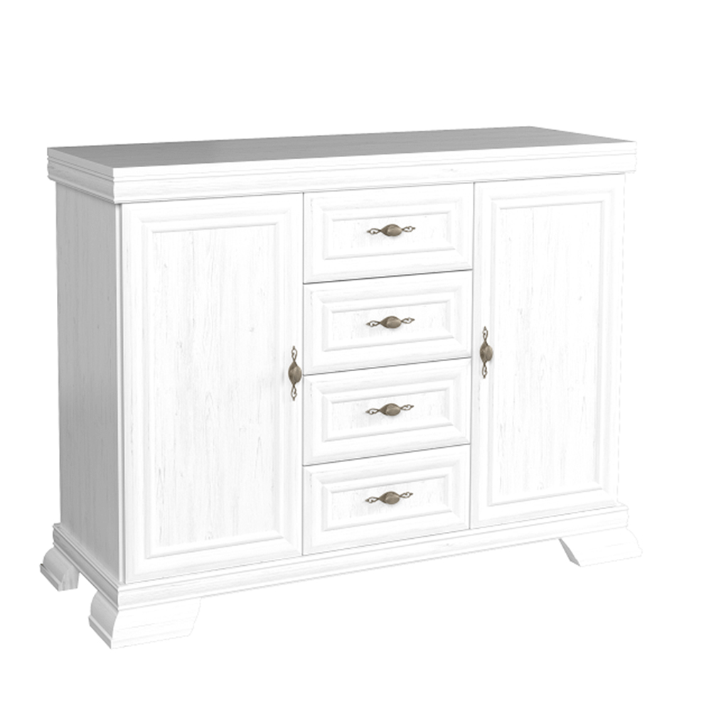 Comoda Kraz masivă și elegantă în stilul rustic, are patru sertare și două uși. Picioarele sculptate decorativ, plinte și versiunea color închisă a pinului andersen va fi pe placul celor care iubesc tradiția și își doresc o notă de eleganță în gospodăriile lor.