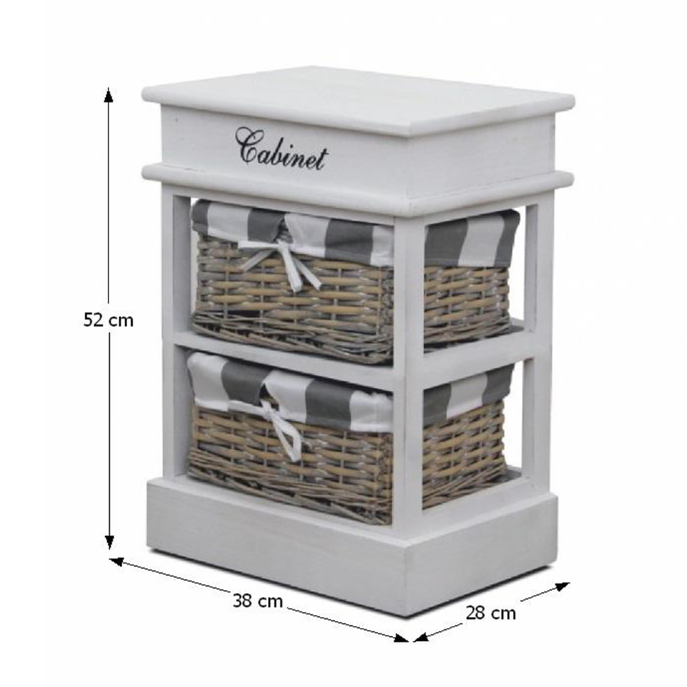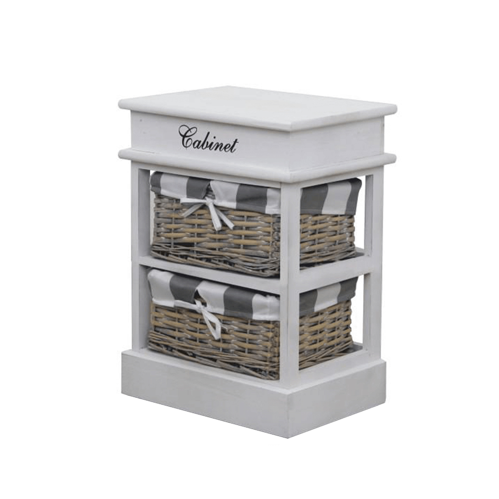 Comodă interesantă în stil rustic, cu cadru solid și două coșuri de răchită. Comoda va fi un accesoriu de design în hol, dormitor, camera de zi sau baie. Versiunea color de alb în combinație cu gri.