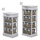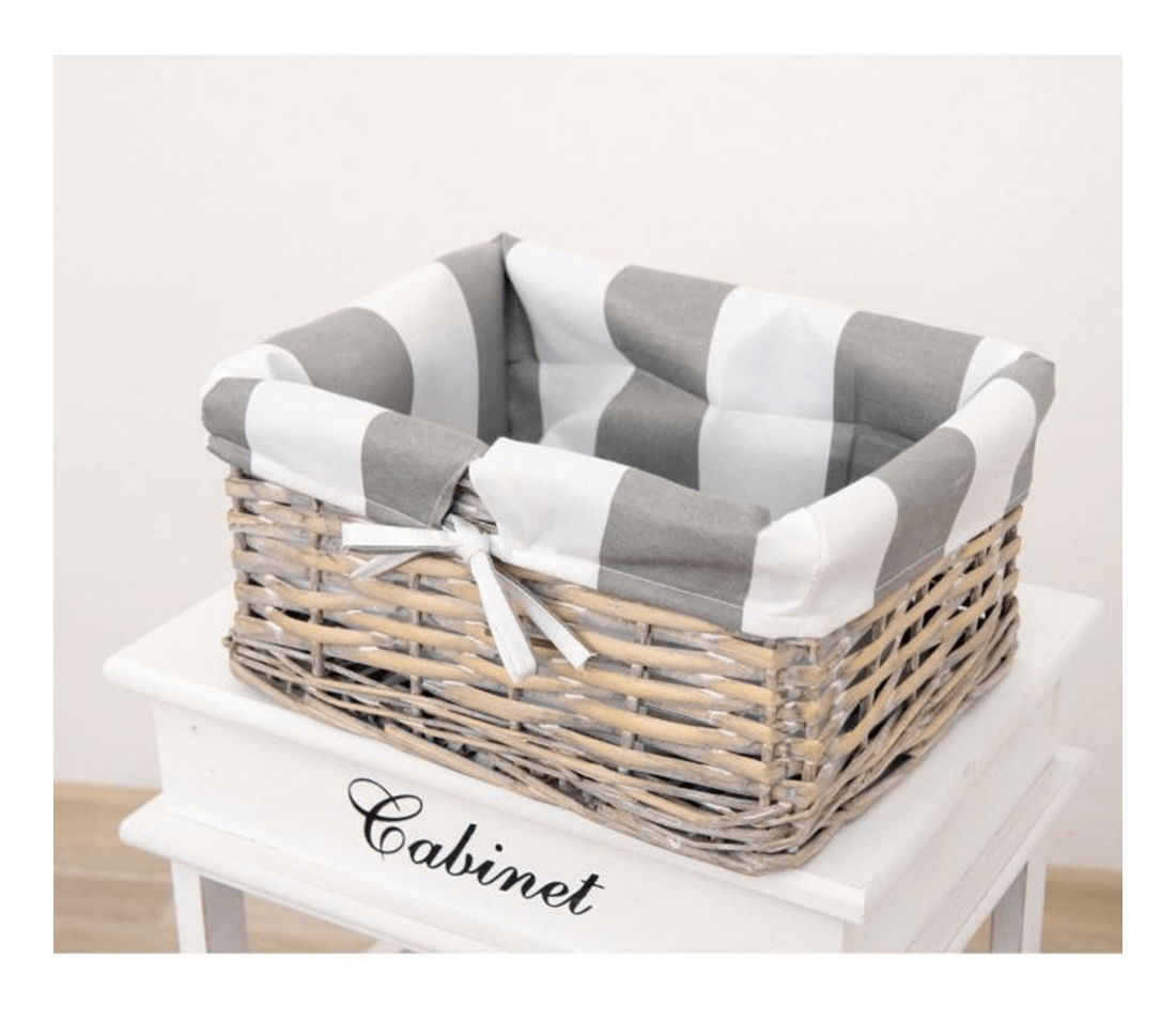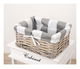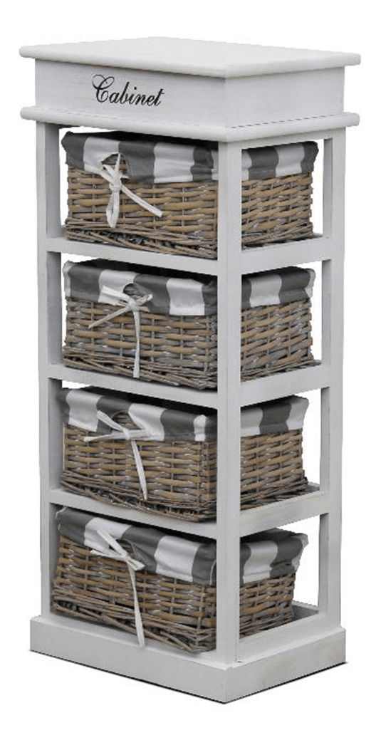 Decorați-vă gospodăriile în stilul rustic, care devine din ce în ce mai popular. Această comodă are un cadru solid din lemn și patru coșuri de răchită frumoase, decorate cu o panglică și acoperite cu material în dungi. Acesta va fi un accesoriu frumos în vestibulele dvs., în camera de zi sau în baie. Versiunea color a comodei este alb în combinație cu culoarea gri.